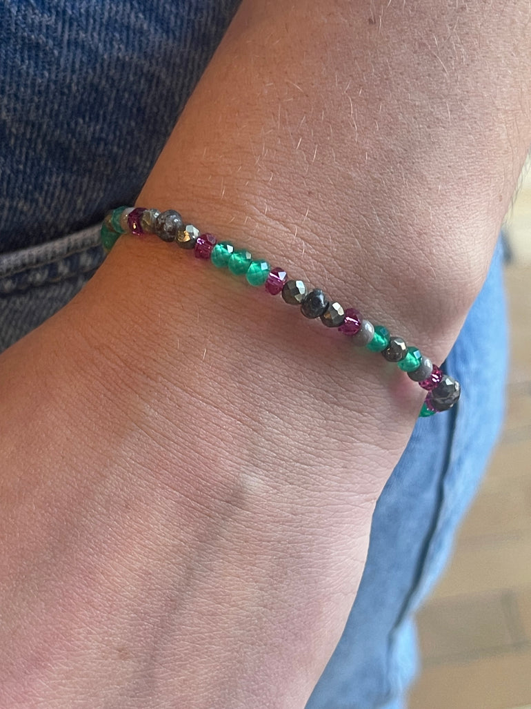 Add a bohemian touch to your outfit with our magnificent Mantra Bracelet. Handmade in Quebec in the Indian style, it is rich in vibrant colors and adorned with semi-precious stones and Swarovski® crystals.