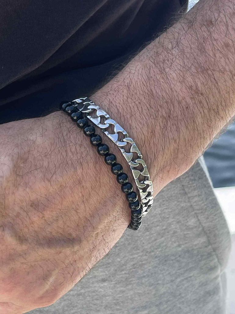 Discover this pair of bracelets that combine elegance and modernity. The first is adorned with black beads for a simple and refined touch, while the second features a chunky chain with a simple yet striking design. Together, they strike the perfect balance between boldness and sophistication to enhance your wrist for any occasion.
