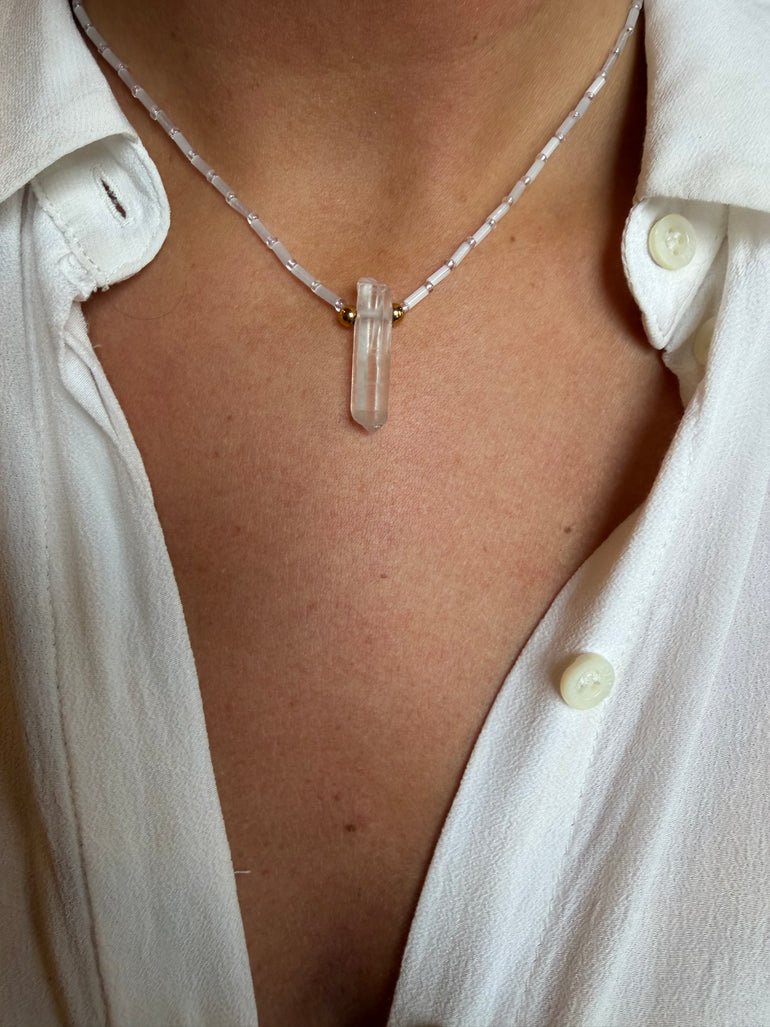 Découvrez ce collier orné un prisme de quartz naturel, son port léger et confortable deviendra rapidement un incontournable de votre collection, à porter au quotidien ou en superposition pour plus de caractère.