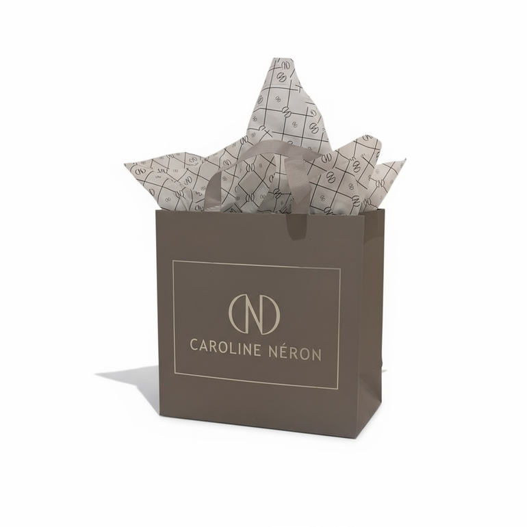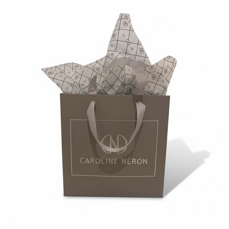 Petit sac rigide avec 2 feuilles de papier de soie incluses.