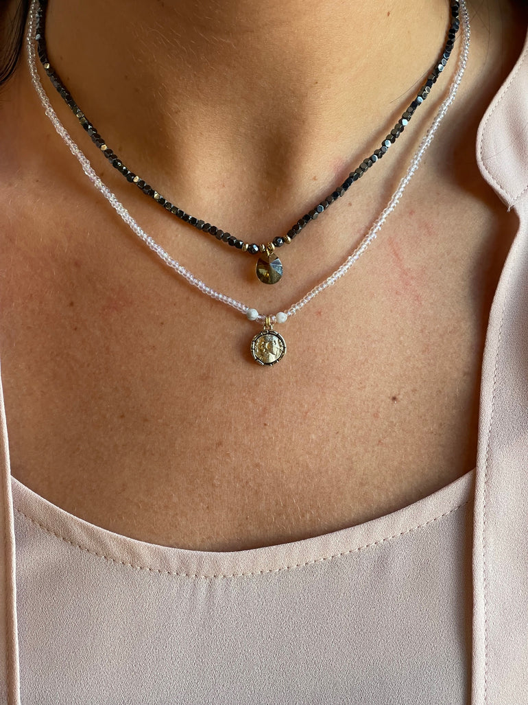 Length: 16 inches (40.64 cm) plus a 2-inch (5.08 cm) extension chain Czech seed beads, howlite The pendant measures 15 mm Gold - plated stainless steel and brass Made in Quebec |