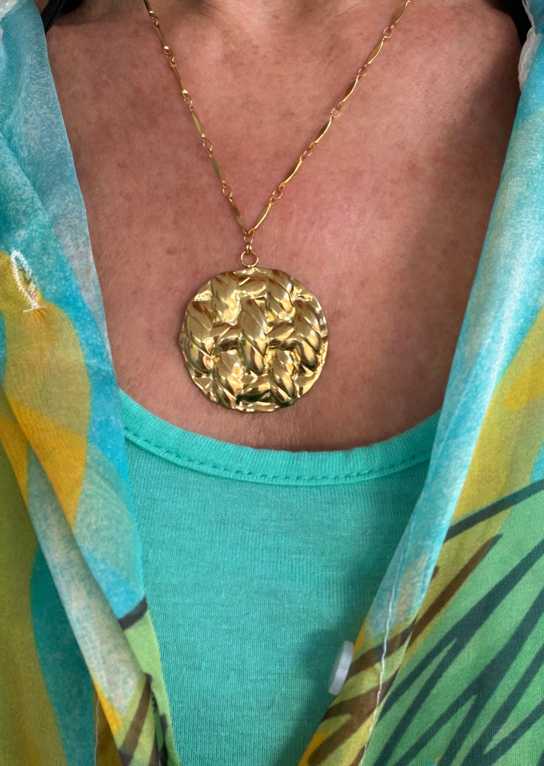 ֎ Gold-plated stainless steel ֎ Measures 18 inches (45.72 cm) plus a 2-inch (5.08 cm) extension chain ֎ The pendant is 1.75 inches (4.45 cm) long |